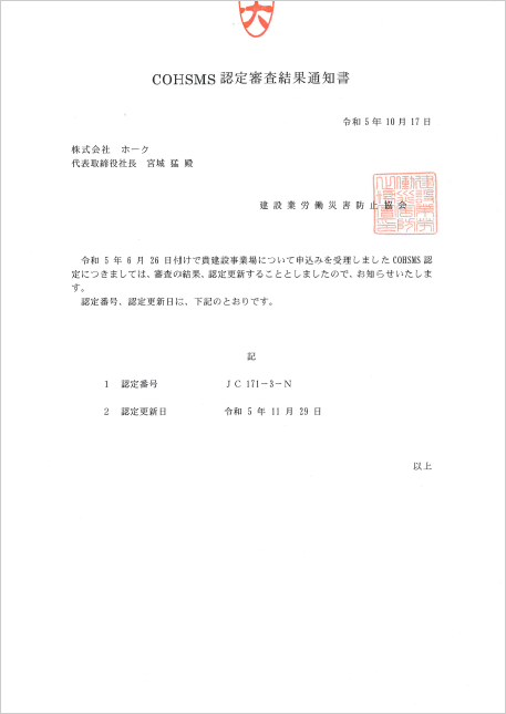 当社は2017年11月29日に初回の「COHSMS認定」を取得し、2023年10月17日に2度目の更新が認められました。