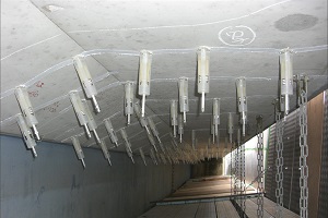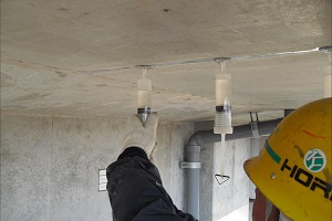 炭素繊維等の繊維シートを貼り付けたコンクリートに削孔し、ドライロックピンを打ち込み、キャッピングすることにより、コンクリート中の不必要な水分を排出して、加えて繊維シートを物理的に固定する補助・補強工法です。