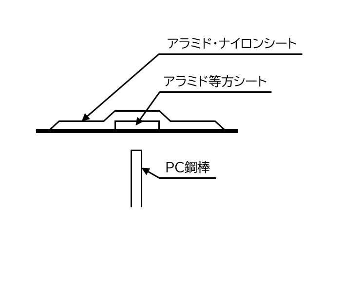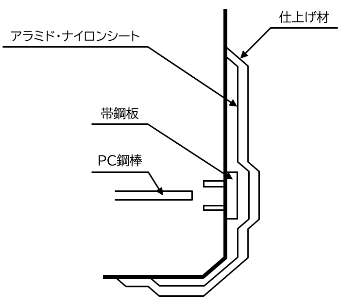 • 高靭性のアラミド・ナイロン繊維シートと帯鋼板を併用することにより、PC鋼棒の突出エネルギーを吸収し、突出防止と共にコンクリート片はく落を防止します。