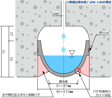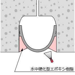 • 完成した導水路断面の水中硬化型パテは「くさび構造」であるため、非常に高い水圧にも耐えられ、耐久性も向上します。