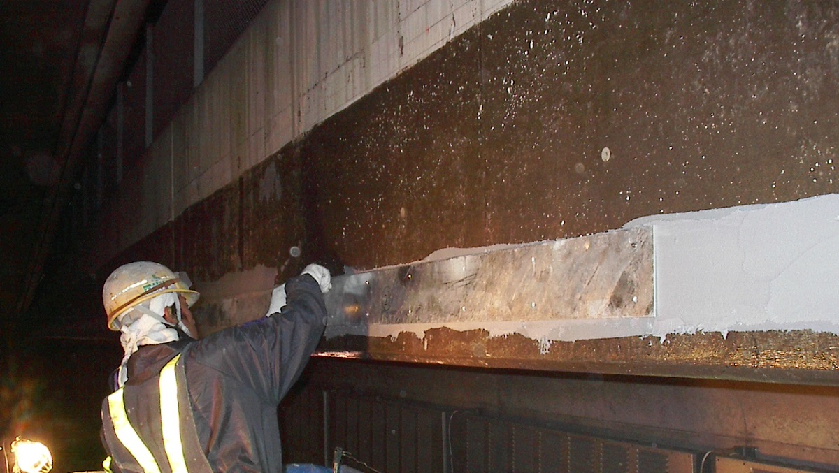 エポキシパテを均一に塗布し、アンカーを打ち込みながら帯鋼板を所定の位置に取り付けます。