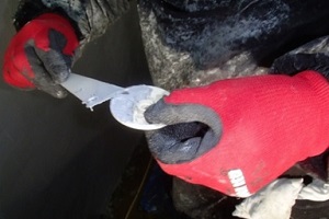 水中硬化型エポキシ樹脂パテ(ジェームスB-007)を、溝と導水板ゴムの間に壺型を形成するように充填します。