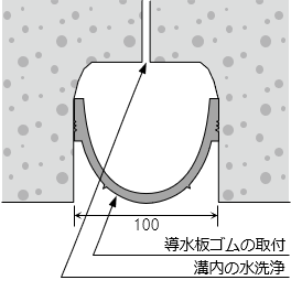 既存のコンクリート構造躯体目地および打継ぎ部などの箇所に溝を作り、伸縮性の良いクロロプレンゴム製ガイド(導水板ゴム)を取り付けた導水工法です。